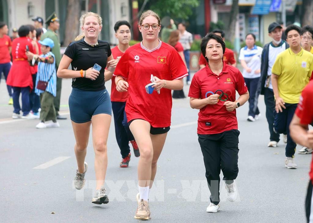 Du khách quốc tế hào hứng tham gia Ngày chạy Olympic 2026 "Vì sức khoẻ toàn dân - Vì an ninh Tổ quốc". Ảnh: Phạm Kiên - TTXVN