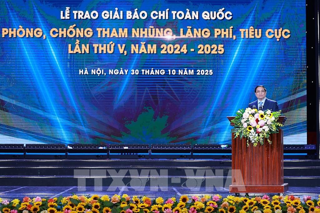 Thủ tướng Phạm Minh Chính phát biểu tại Lễ trao Giải Báo chí toàn quốc phòng, chống tham nhũng, lãng phí, tiêu cực lần thứ 5, năm 2024 – 2025. Ảnh: Dương Giang-TTXVN