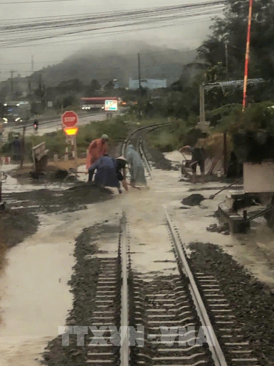 Mưa lớn khiến 4 tàu chở hành khách phải dừng lưu thông ở hai đầu địa phận xã Nam Cam Ranh.Ảnh: TTXVN phát