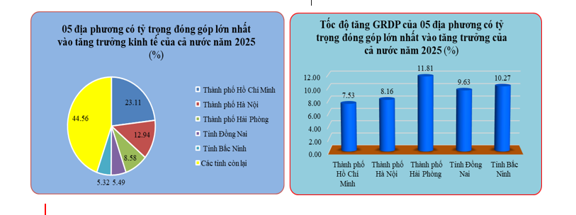 Theo Báo cáo về tốc độ tăng trưởng sản phẩm trên địa bàn (GRDP) của 34 tỉnh, thành phố trực thuộc Trung ương năm 2025 do Cục Thống kê (Bộ Tài chính) công bố, Hà Nội, TP. Hồ Chí Minh, Hải Phòng, Đồng Nai và Bắc Ninh tiếp tục giữ vai trò trụ cột của nền kinh tế, đóng góp lớn nhất vào tăng trưởng GDP cả nước.