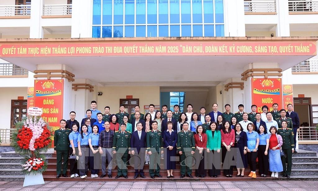 Các đại biểu Thông tấn xã Việt Nam và Sư đoàn Bộ binh 304 chụp ảnh chung. Ảnh: Tuấn Anh - TTXVN