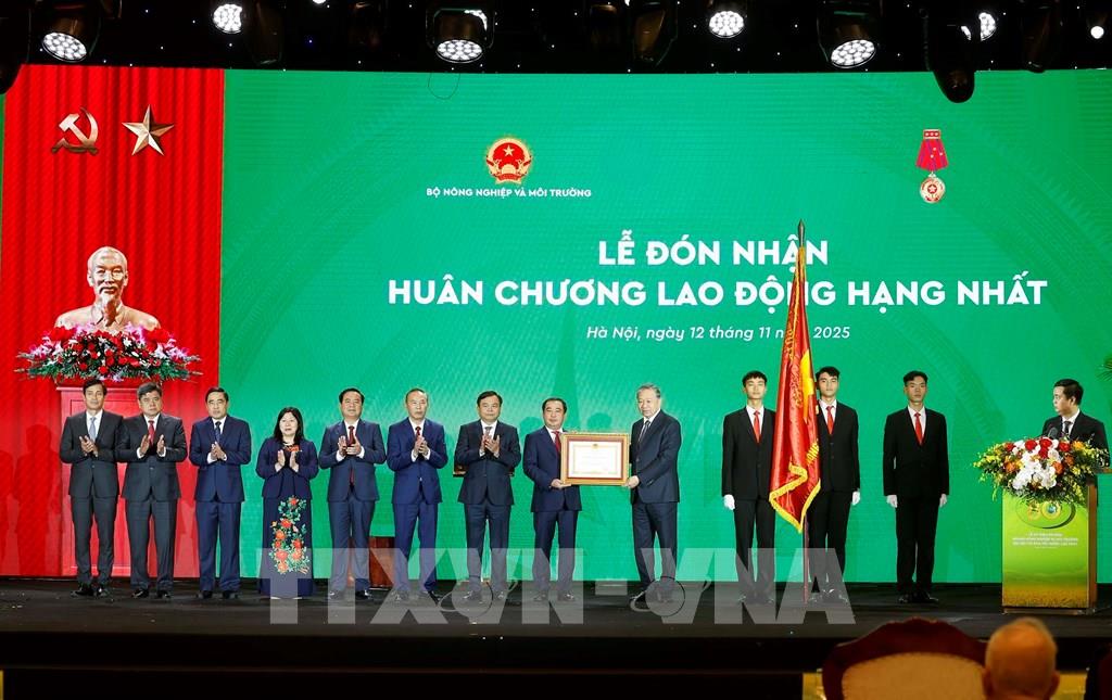 Tổng Bí thư Tô Lâm trao Huân chương Lao động hạng Nhất tặng Bộ Nông nghiệp và Môi trường. Ảnh: Thống Nhất – TTXVN