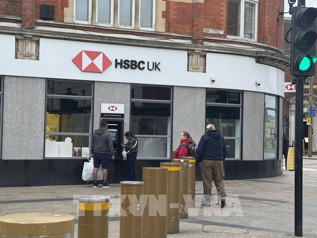 Người dân sử dụng cây ATM bên ngoài chi nhánh HSBC ở London. Ảnh: Hương Giang - PV TTXVN tại Anh