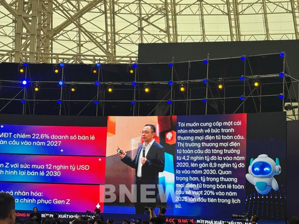 Ông Jim Yang, Giám Đốc Phát triển Thị trường châu Á - Thái Bình Dương, Amazon Global Selling chia sẻ tại hội nghị. Ảnh: Uyên Hương/Bnews/Vnanet.vn