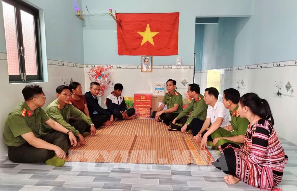 Công an tỉnh Đắk Lắk chia sẻ niềm vui cùng hộ gia đình đầu tiên hoàn thành nhà mới trong "Chiến dịch Quang Trung" do lực lượng Công an đảm nhiệm. Ảnh: Tường Quân – TTXVN