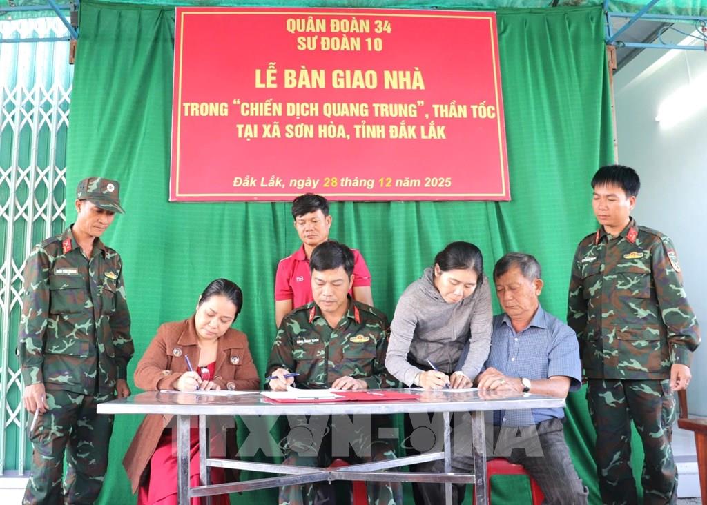 Chiều 28/12, Sư đoàn 10, Quân đoàn 34 (Bộ Quốc phòng) tổ chức bàn giao 5 căn nhà đầu tiên trong Chiến dịch “Thần tốc Quang Trung” cho 5 hộ dân tại thôn Trung Hòa, xã Sơn Hòa, tỉnh Đắk Lắk.