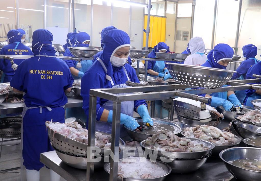 Sản xuất chế biến thủy sản xuất khẩu tại Công ty TNHH Huy Nam, khu cảng cá Tắc Cậu, xã Bình An (An Giang). Ảnh: Lê Huy Hải-TTXVN