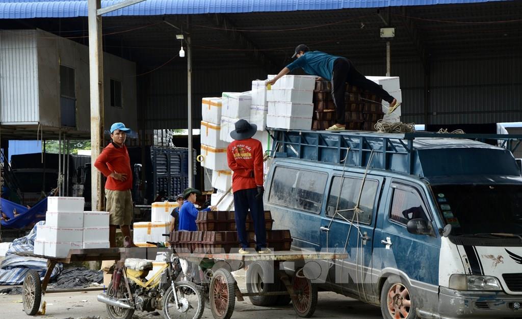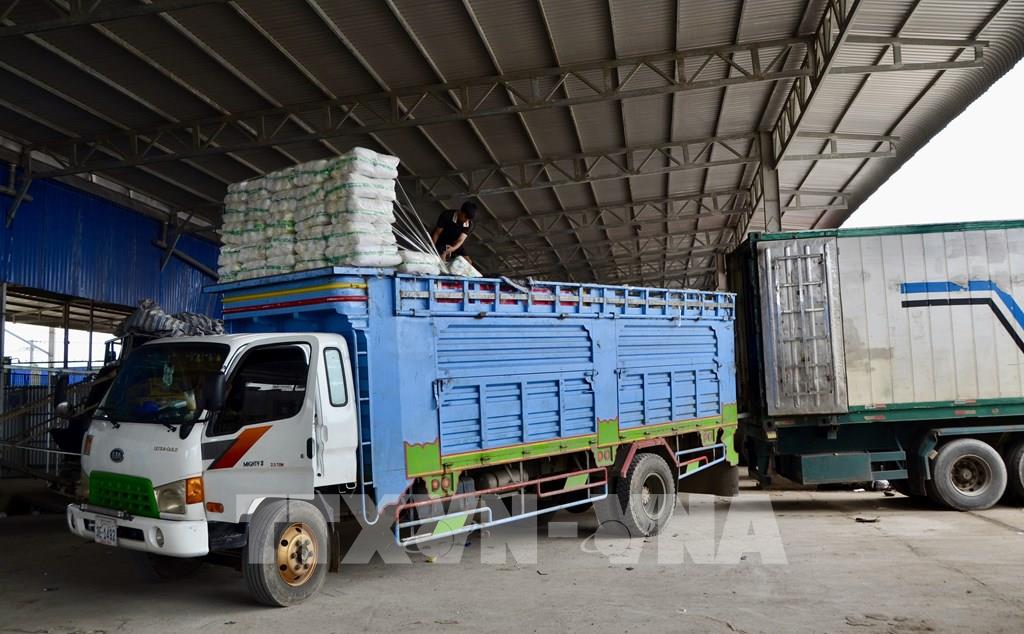 Công nhân chuẩn bị hàng nông sản xuất khẩu sang Campuchia qua cửa khẩu quốc gia Khánh Bình, tỉnh An Giang. Ảnh: Thanh Sang-TTXVN