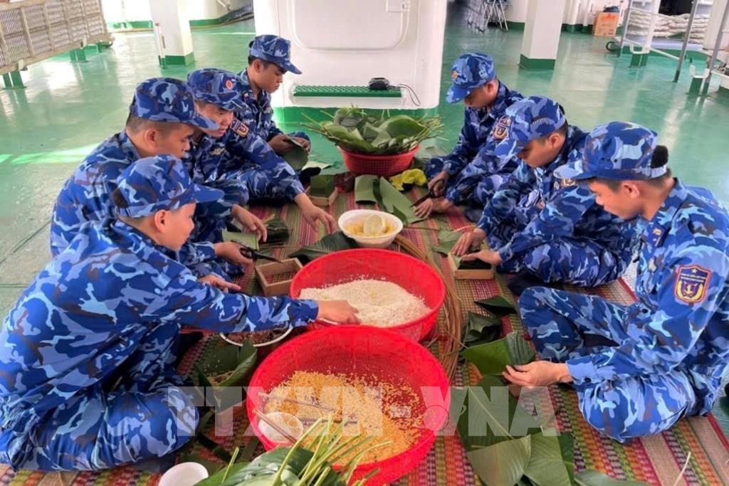 Giữa đại dương mênh mông, các cán bộ, chiến sĩ Tàu CSB 8005 quây quần gói bánh chưng mang một ý nghĩa rất đặc biệt và thiêng liêng. Gói bánh trên tàu là một nghệ thuật, không có bàn vững, anh em phải trải chiếu giữa khoang, chân tì vào gờ cửa để giữ thăng bằng; lạt được buộc chặt hơn, bánh được gói chắc tay hơn để dù tàu có rung lắc trong nồi luộc, bánh vẫn giữ nguyên hình dáng. Việc chuẩn bị chu đáo này chính là lời khẳng định bản lĩnh, dù gian khó, “tinh thần thép” vẫn không làm mất đi nét đẹp tâm hồn của người lính Bộ đội Cụ Hồ. Thuyền trưởng Tàu CSB 8005 chia sẻ, nồi bánh chưng xanh giữa biển trời Tây Nam vừa là món ăn truyền thống của dân tộc, vừa là lời nhắn gửi: Dù xa đất liền, Tết vẫn trọn vẹn, tình đồng đội vẫn chan hòa và tình yêu Tổ quốc luôn hiện hữu.