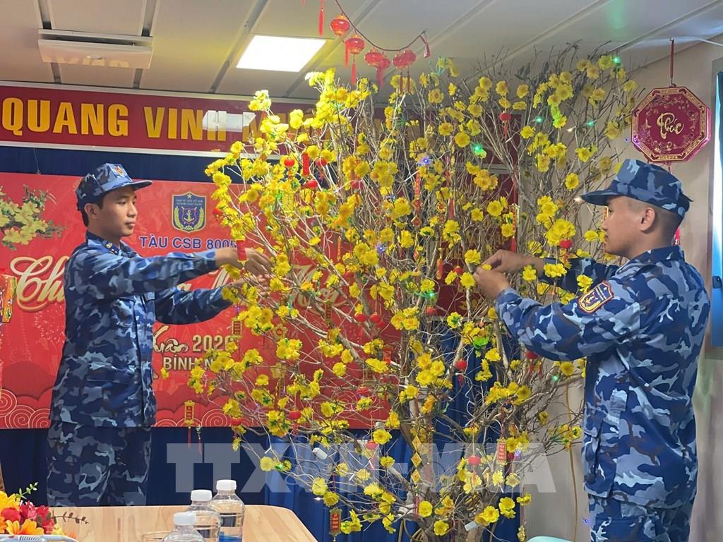 Giữa mênh mông bao la, sóng êm, biển lặng không khí Tết trên Tàu CSB 8005 trở nên nhộn nhịp với giọng nói, tiếng cười lạc quan của những người lính biển. Tại Phòng Hồ Chí Minh - nơi được gọi là “tâm hồn” của con tàu, các chiến sĩ tỉ mẩn cắt dán từng bông hoa mai, hoa đào bằng giấy màu gắn lên những cành cây khô mang từ đất liền. Bàn thờ Tổ quốc trang trí trang nghiêm với ảnh Bác Hồ như thấy “Bác đang cùng chúng cháu hành quân”, trở thành điểm tựa tinh thần, giúp cán bộ, chiến sĩ thêm kiên cường, thêm tự hào để vững vàng trước sóng gió, hoàn thành sứ mệnh thiêng liêng bảo vệ chủ quyền biển đảo.
