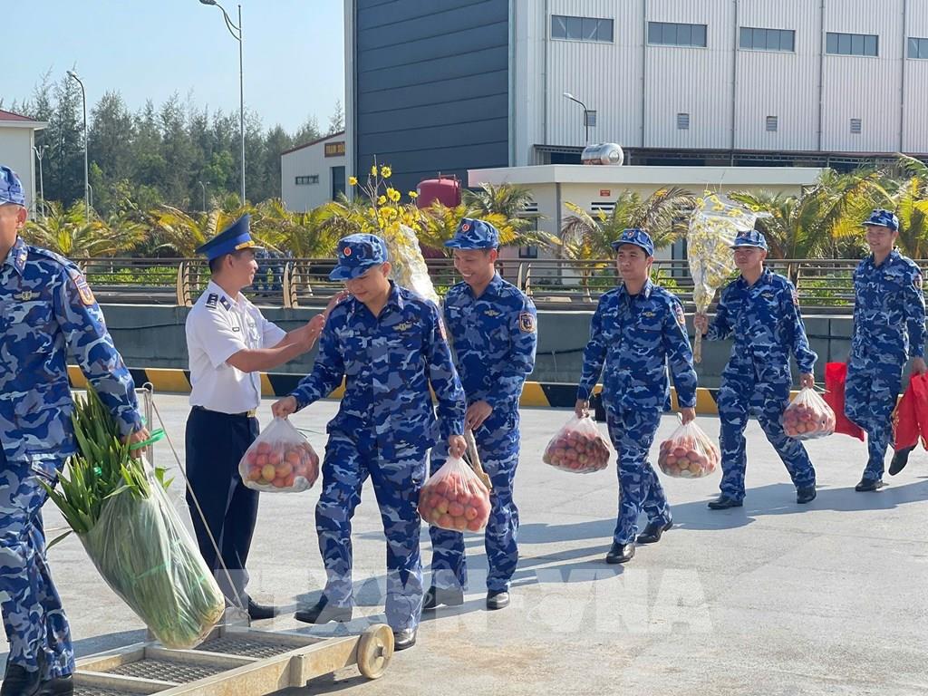 Cán bộ, chiến sĩ Tàu CSB 8005, chuẩn bị nhu yếu phẩm trước khi lên đường thực hiện nhiệm vụ dịp Tết Nguyên đán Bính Ngọ 2026. Ảnh: TTXVN phát