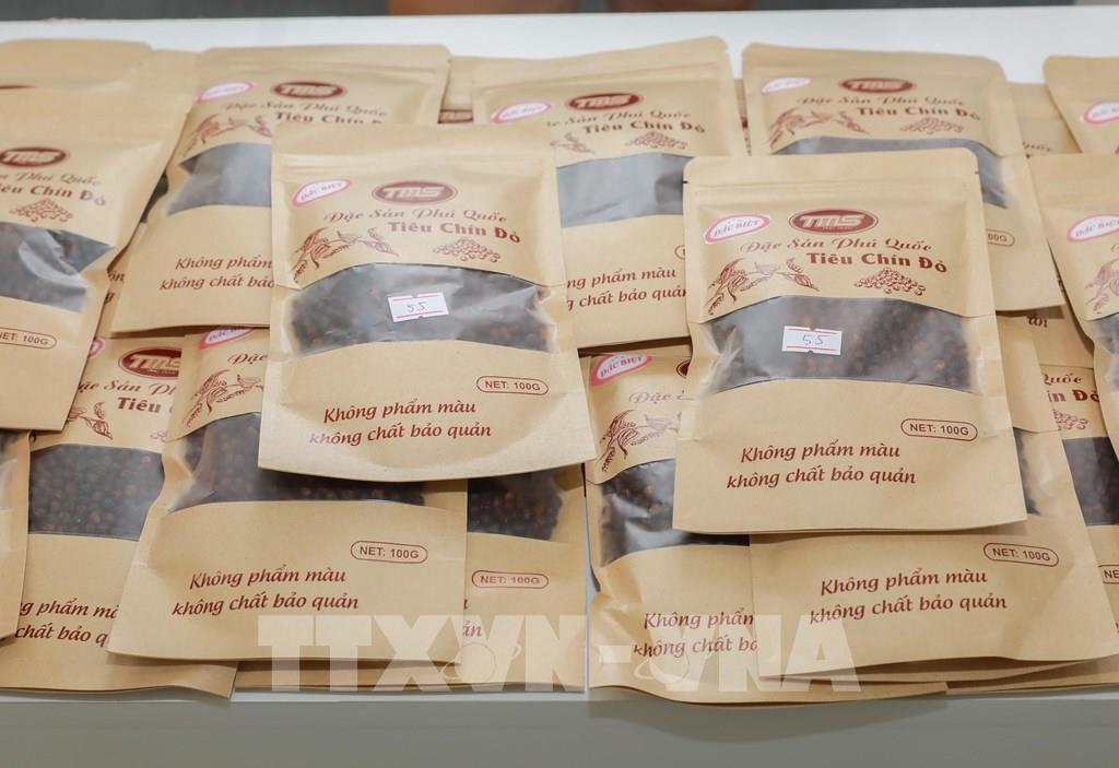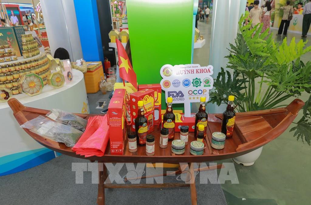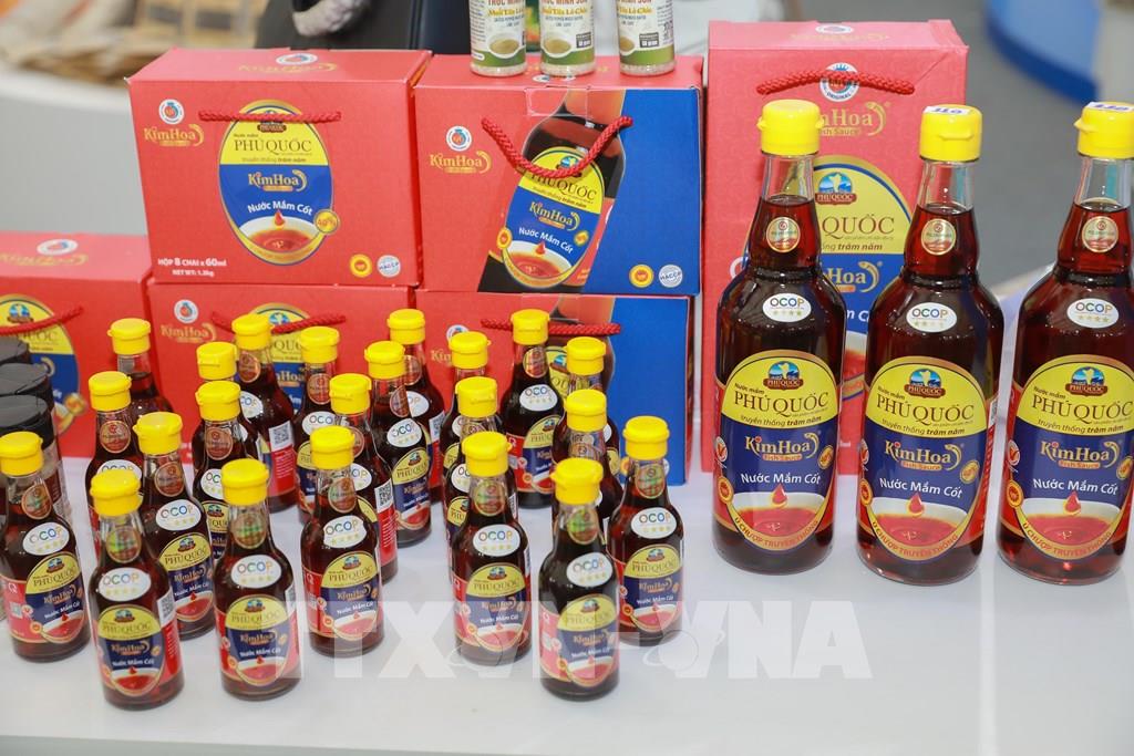 Các sản phẩm OCOP của Công ty TNHH MTV nước mắm Kim Hoa (Phú Quốc, An Giang) trưng bày tại Hội chợ mùa Thu. Ảnh: Phan Phương – TTXVN