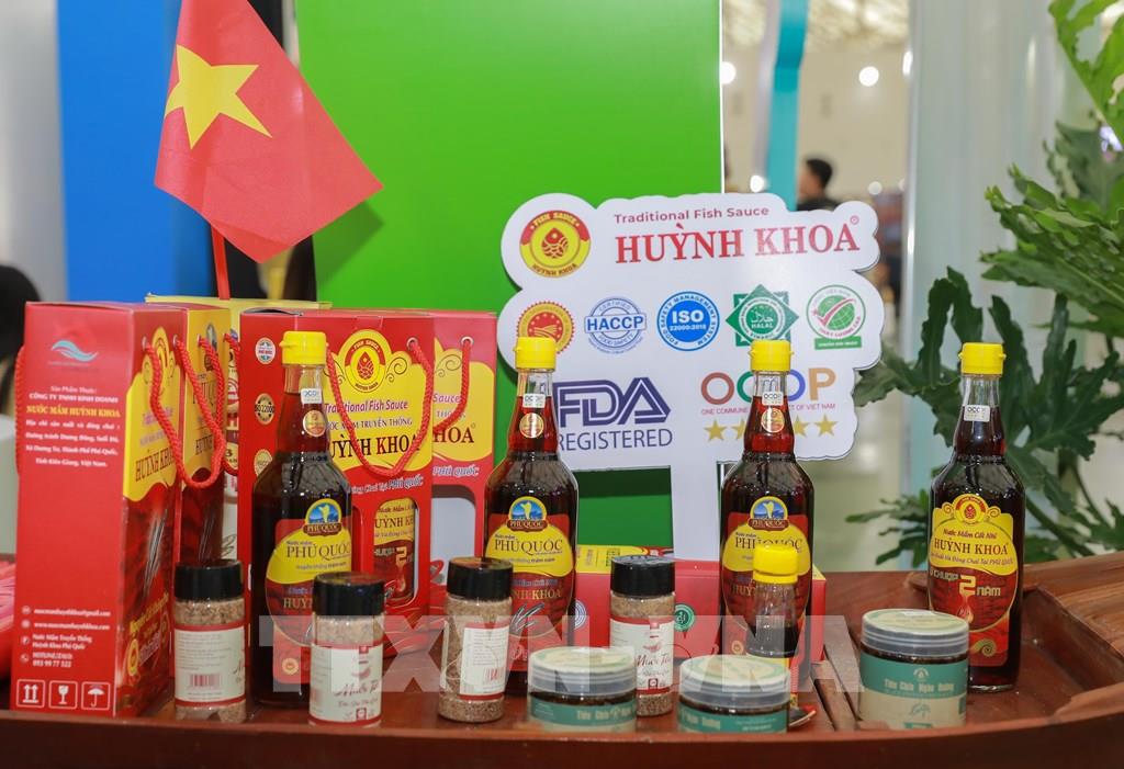 Các sản phẩm OCOP của thương hiệu nước mắm Huỳnh Khoa (Phú Quốc, An Giang) trưng bày tại Hội chợ mùa Thu. Ảnh: Phan Phương – TTXVN