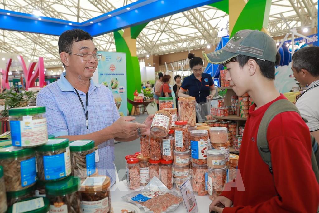 Các sản phẩm OCOP của thương hiệu hải sản Thái Thuỷ, tỉnh An Giang trưng bày tại Hội chợ mùa Thu thu hút đông đảo du khách. Ảnh: Phan Phương – TTXVN