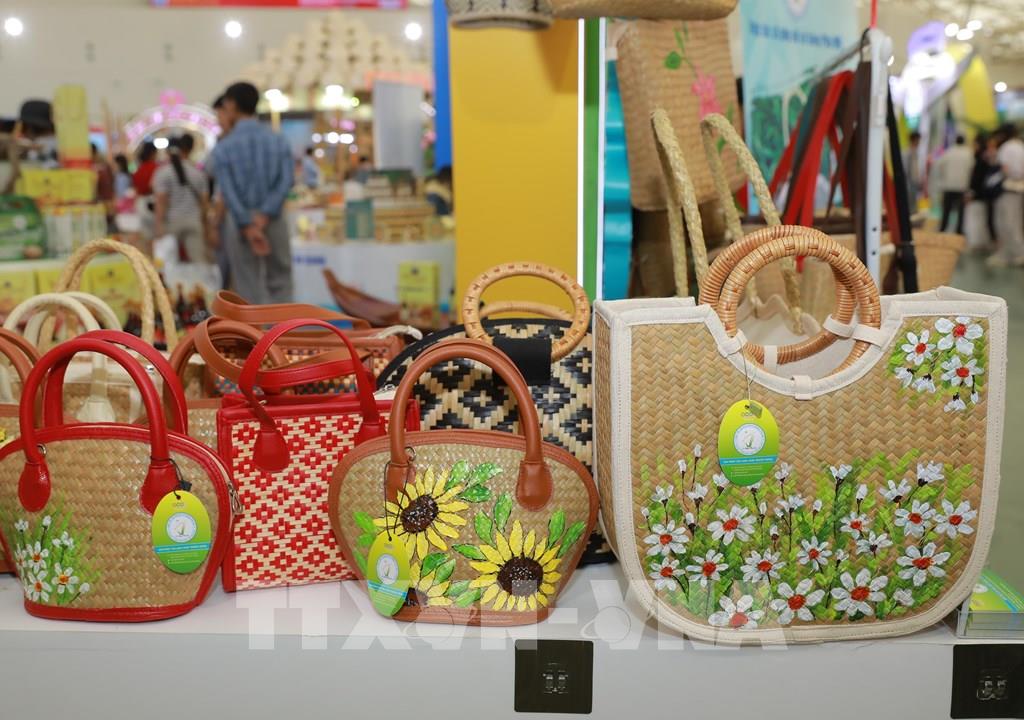 Các sản phẩm từ nguyên liệu thân thiện với môi trường của HTX Phụ nữ Cỏ bàng Phú Mỹ (xã Giang Thành, An Giang) đạt tiêu chuẩn OCOP 4 sao được trưng bày tại gian hàng An Giang. Ảnh: Phan Phương – TTXVN
