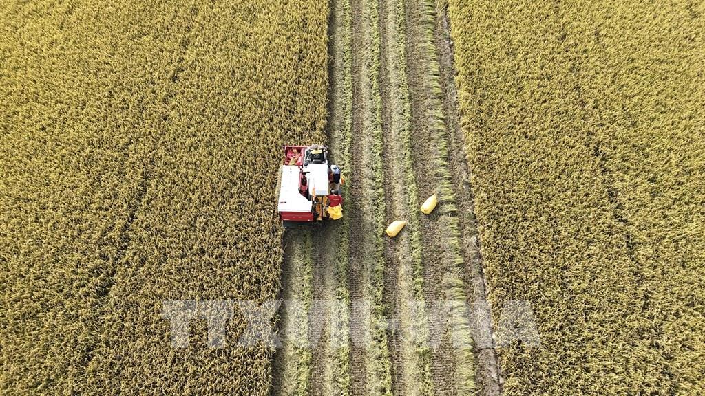 Thu hoạch lúa tham gia Đề án 1 triệu ha chất lượng cao trên địa bàn xã Bình Mỹ, tỉnh An Giang. Ảnh: Thanh Sang - TTXVN
