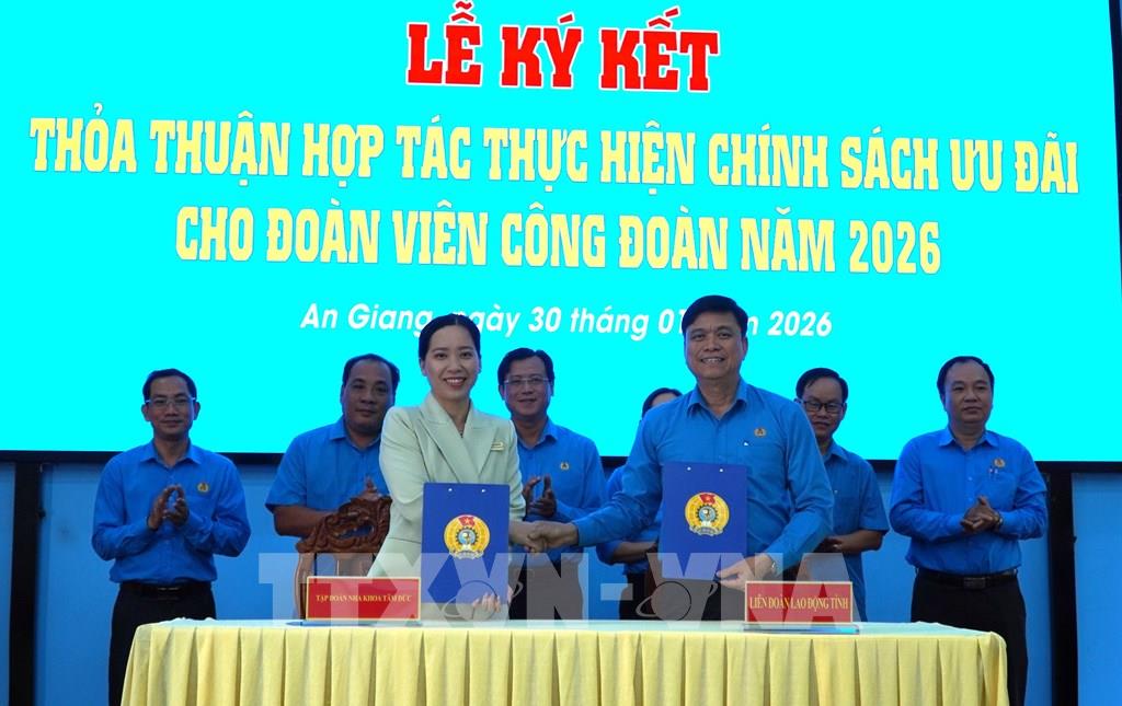 LĐLĐ tỉnh An Giang ký kết thỏa thuận hợp tác với Công ty Cổ phần Tập đoàn Nha khoa Sài Gòn Tâm Đức. Ảnh: Văn Sĩ - TTXVN