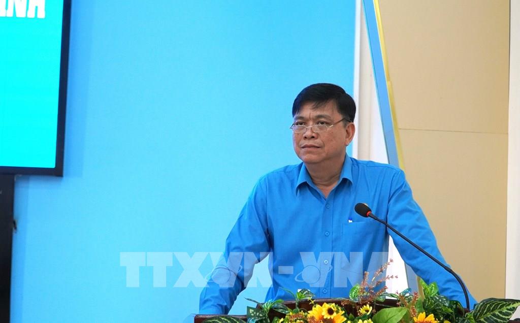 Phó Chủ tịch Ủy ban MTTQ Việt Nam tỉnh, Chủ tịch LĐLĐ tỉnh An Giang Đỗ Trần Thịnh phát biểu. Ảnh: Văn Sĩ - TTXVN