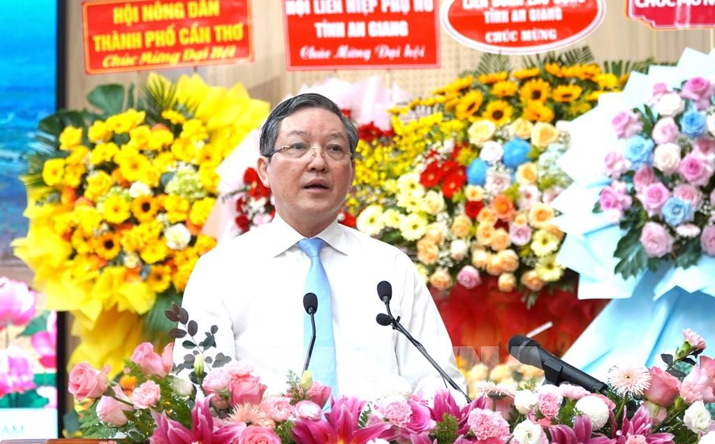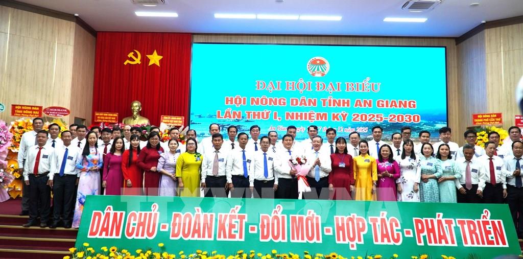 Ông Lương Quốc Đoàn, Phó Chủ tịch Ủy ban trung ương MTTQ Việt Nam, Chủ tịch BCH Trung ương Hội Nông dân Việt Nam tặng hoa chúc mừng Ban chấp hành Hội Nông dân tỉnh An Giang khóa I, nhiệm kỳ 2025-2030. Ảnh: Văn Sĩ - TTXVN