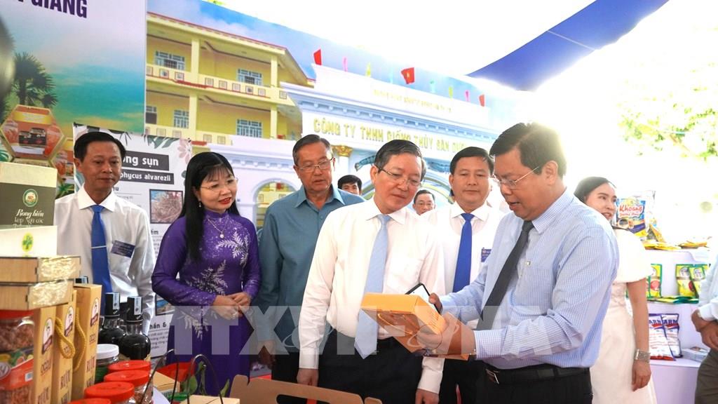 Lãnh đạo Trung ương Hội Nông dân Việt Nam cùng lãnh đạo tỉnh An Giang tham quan gian hàng trưng bày tại Đại hội. Ảnh: Văn Sĩ - TTXVN