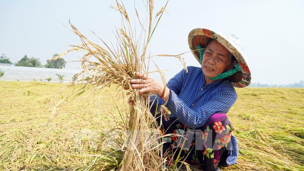 Bà Đặng Văn Út, xã Hòn Đất sốt ruột khi 2ha lúa quá ngày thu hoạch nhưng chưa thuê được máy cắt. Ảnh: Văn Sĩ - TTXVN