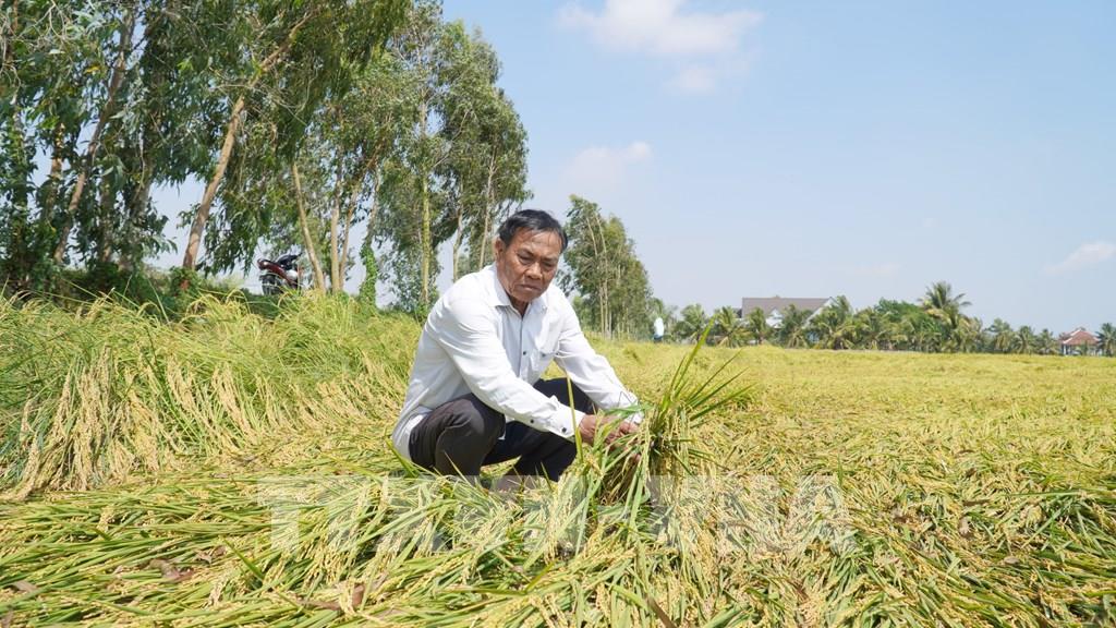 Ông Trần Văn Mạnh, xã Hòn Đất sốt ruột khi 5ha lúa quá ngày thu hoạch nhưng chưa thuê được máy cắt. Ảnh: Văn Sĩ - TTXVN