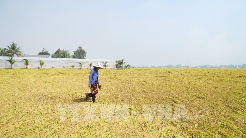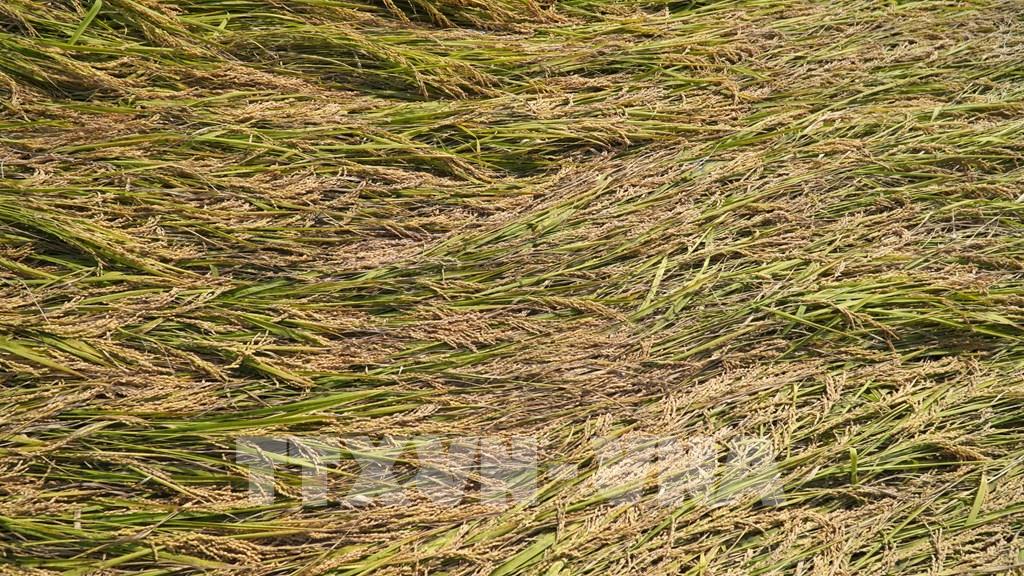 Thiếu máy cắt, nhiều ruộng lúa của nông dân xã Hòn Đất bị đổ ngã, giảm năng suất, chất lượng. Ảnh: Văn Sĩ - TTXVN