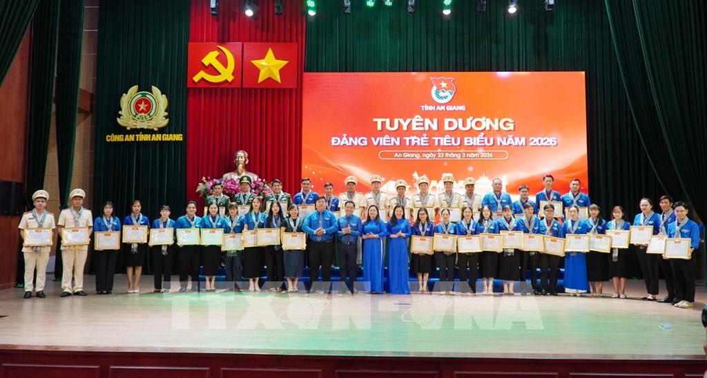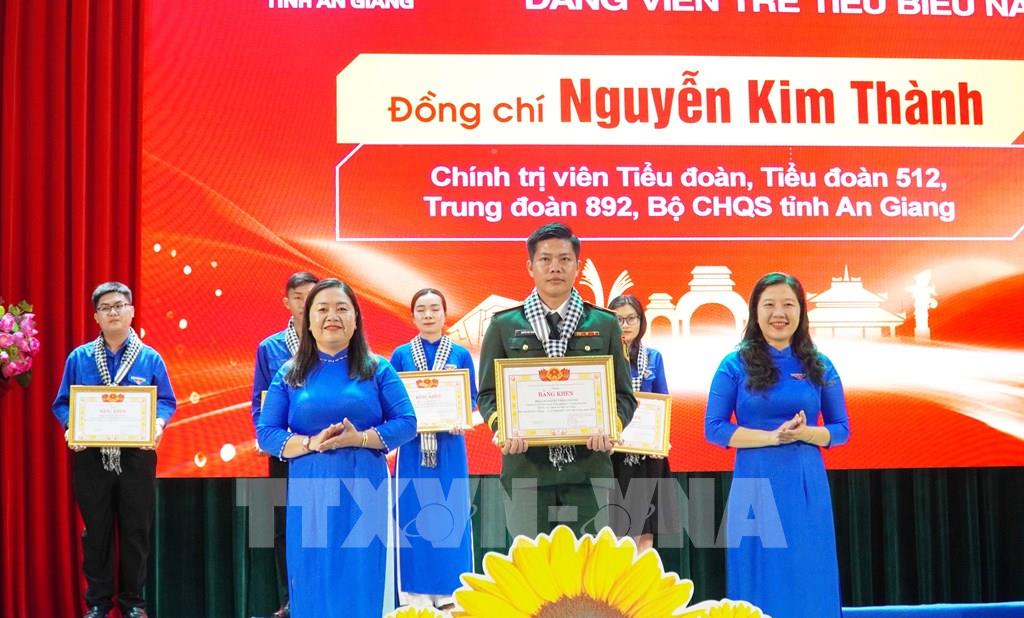 Lãnh đạo Tỉnh đoàn An Giang trao tuyên dương đảng viên trẻ tiêu biểu 2026 Ảnh: Văn Sĩ - TTXVN