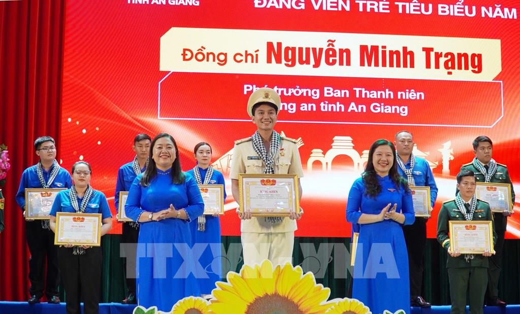 Các đảng viên trẻ tiêu biểu của tỉnh An Giang được tuyên dương nhân dịp kỷ niệm 95 năm Ngày thành lập Đoàn TNCS Hồ Chí Minh. Ảnh: Văn Sĩ - TTXVN