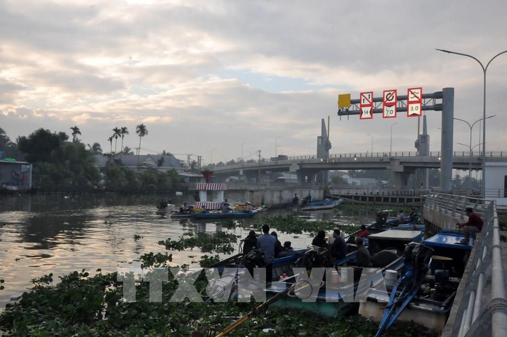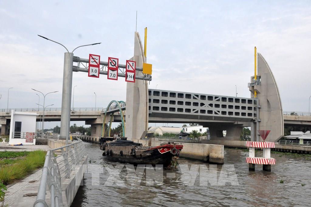 Cống - âu thuyền Vàm Bà Lịch được vận hành phù hợp, bảo đảm hiệu quả phòng, chống hạn mặn và an toàn sản xuất người dân. Ảnh: TTXVN phát