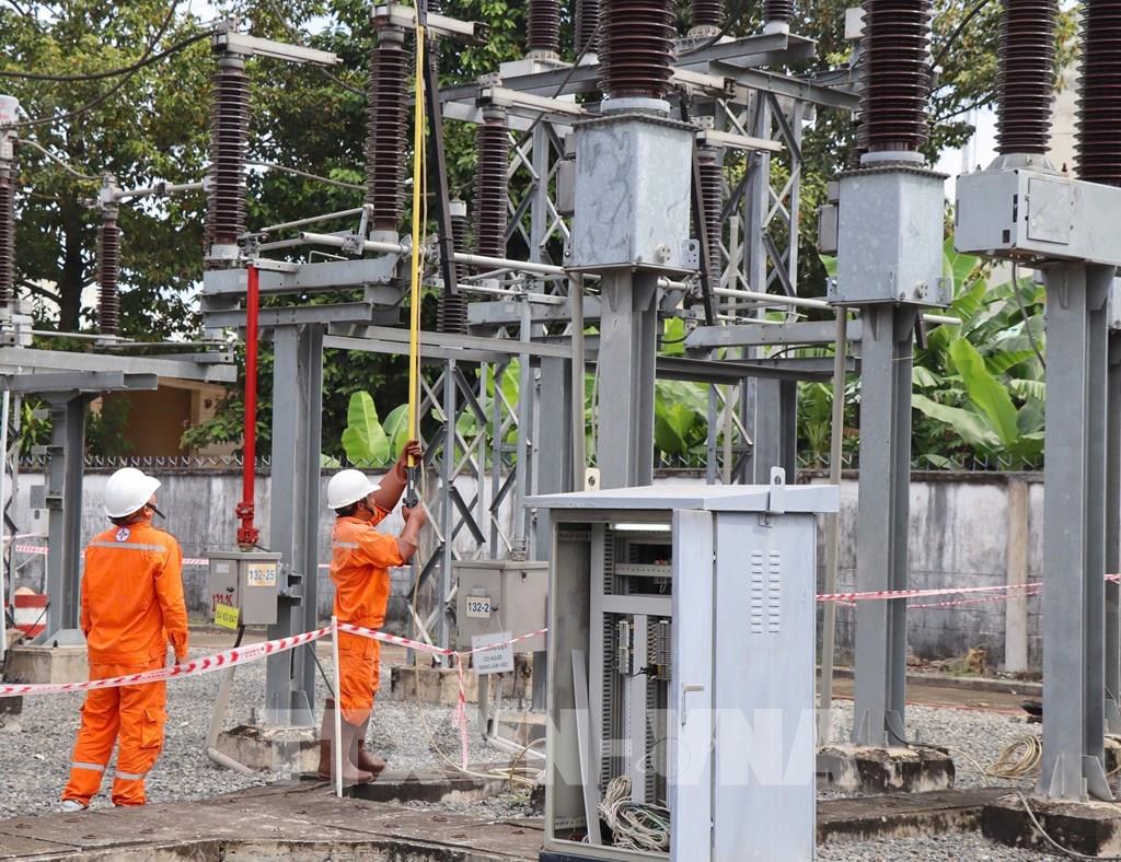 Công nhân ngành điện kiểm tra hệ thống trước khi đóng điện tại Trạm biến áp 110KV Khu công nghiệp Trảng Bàng. Ảnh: Thanh Tân - TTXVN