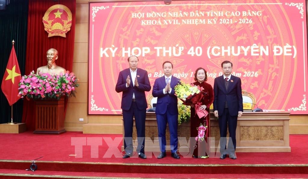 Lãnh đạo tỉnh Cao Bằng tặng hoa chúc mừng tân Phó Chủ tịch UBND tỉnh Cao Bằng Hà Nhật Lệ. Ảnh: Chu Hiệu-TTXVN