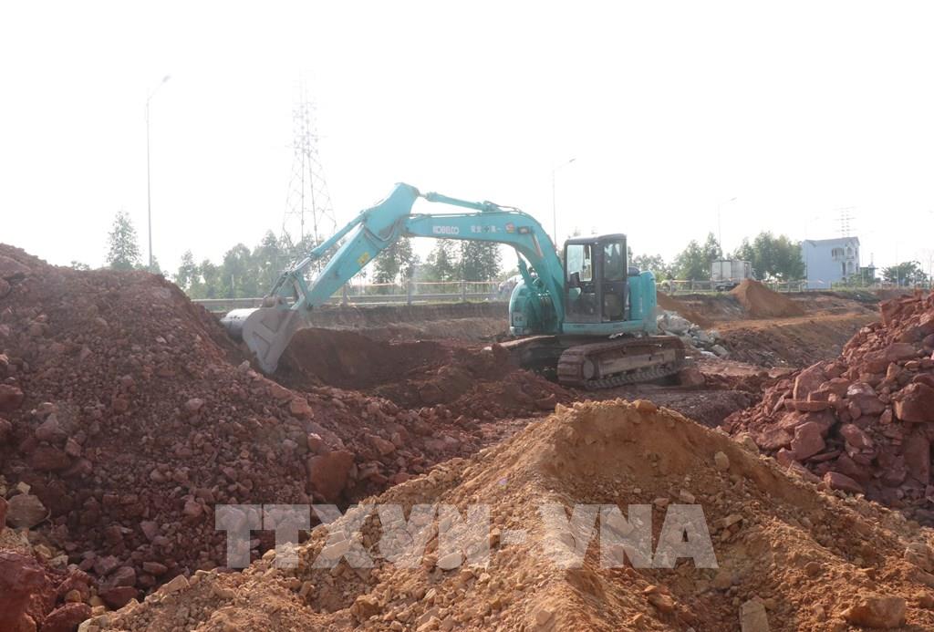 Máy móc được huy động san lấp mặt bằng, thi công nút giao đấu nối Khu công nghiệp Quế Võ số 2 giai đoạn 2 tại xã Phù Lãng, tỉnh Bắc Ninh với Quốc lộ 18. Ảnh: Thanh Thương- TTXVN