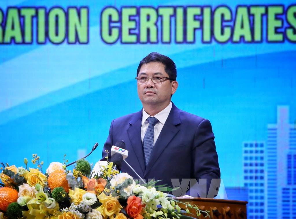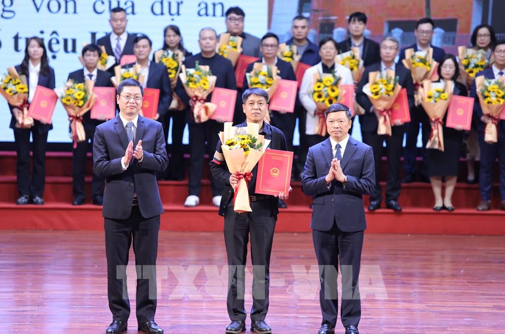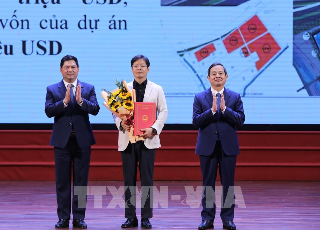 Trao Quyết định chấp thuận chủ trương đầu tư, Giấy chứng nhận đăng ký đầu tư cho các doanh nghiệp. Ảnh: Danh Lam -TTXVN