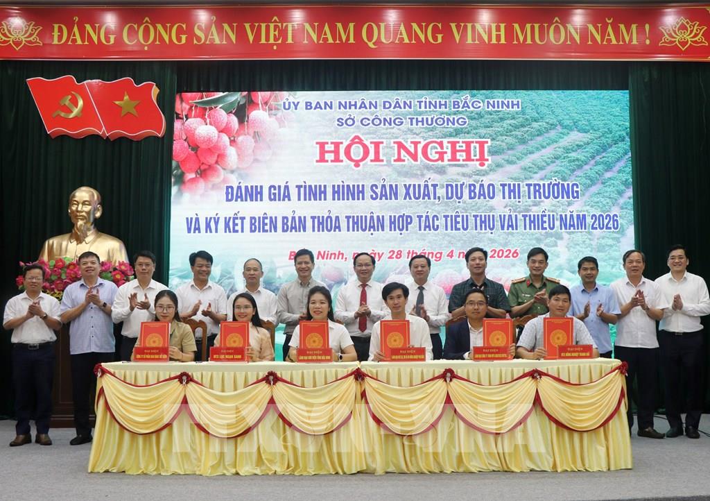 Các đại biểu ký kết hợp tác, hợp đồng tiêu thụ vải thiều Bắc Ninh năm 2026. Ảnh: Thanh Thương- TTXVN