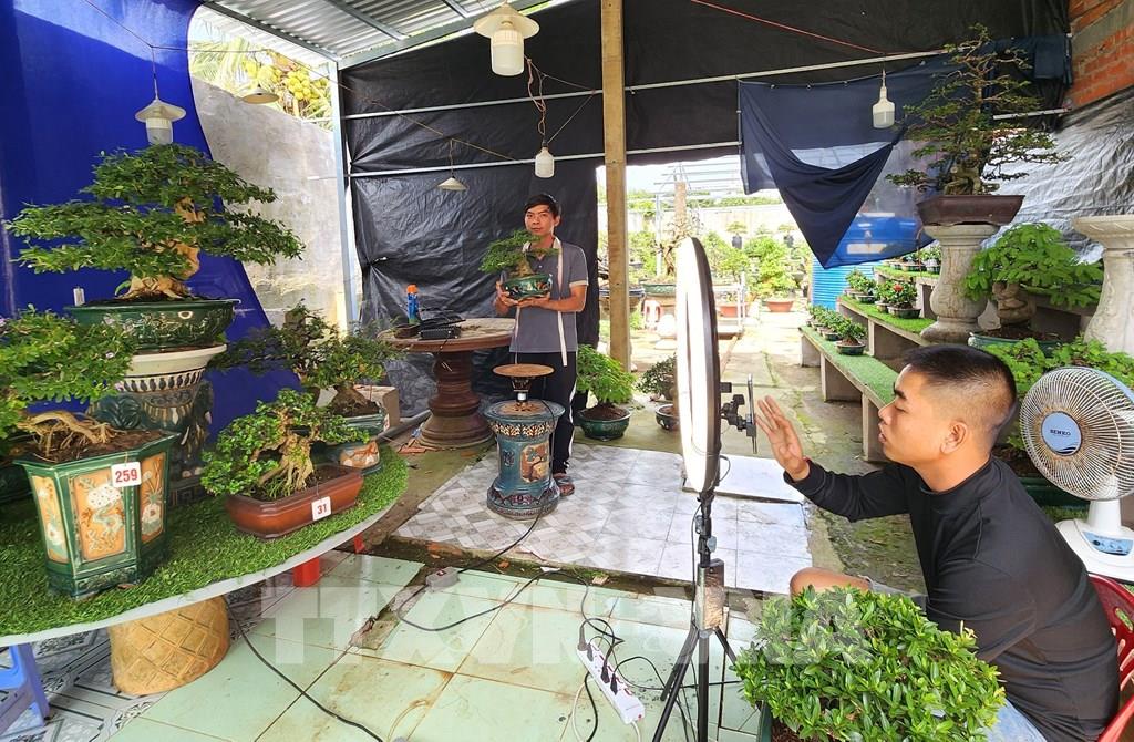 Anh Lê Đình Thanh Long cùng các cộng sự livestream để giới thiệu và bán các sản phẩm bonsa bonsai. Ảnh: Lê Thúy Hằng – TTXVN