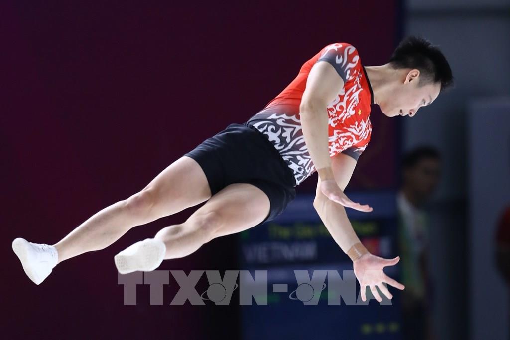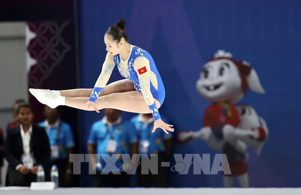 VĐV Phan Thế Gia Hiển thi nội dung Đơn nam đạt thành tích 19,450 điểm, giành HCV đầu tiên cho đội tuyển Aerobic tại SEA Games 32. Ảnh: Hoàng Linh - TTXVN