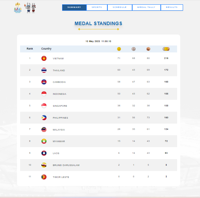 Bảng tổng sắp huy chương SEA Games 32 cập nhật mới nhất đến 11h00 ngày 13/5. Nguồn ảnh: http://games.cambodia2023.com/