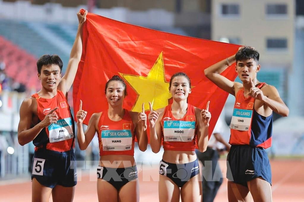 4 vận động viên Tạ Ngọc Tưởng, Nguyễn Thị Ngọc, Lê Ngọc Phúc và Nguyễn Thị Hằng giành HCV nội dung hỗn hợp nam nữ 4x400m, phá kỷ lục SEA Games. Ảnh: Minh Quyết - PV TTXVN tại Thái Lan