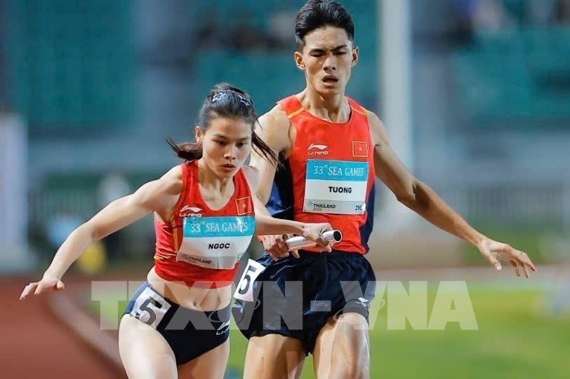 Các VĐV đội tuyển điền kinh Việt Nam thi đấu xuất sắc nội dung hỗn hợp nam nữ 4x400m để giành HCV SEAGames 33. Ảnh: Minh Quyết - PV TTXVN tại Thái Lan