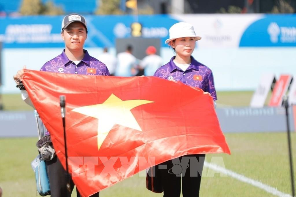 Hai VĐV Đặng Công Đức và Lê Phạm Vân Anh giành HCB nội dung cung 3 dây đôi nam nữ hỗn hợp. Ảnh: Minh Quyết - PV TTXVN tại Thái Lan