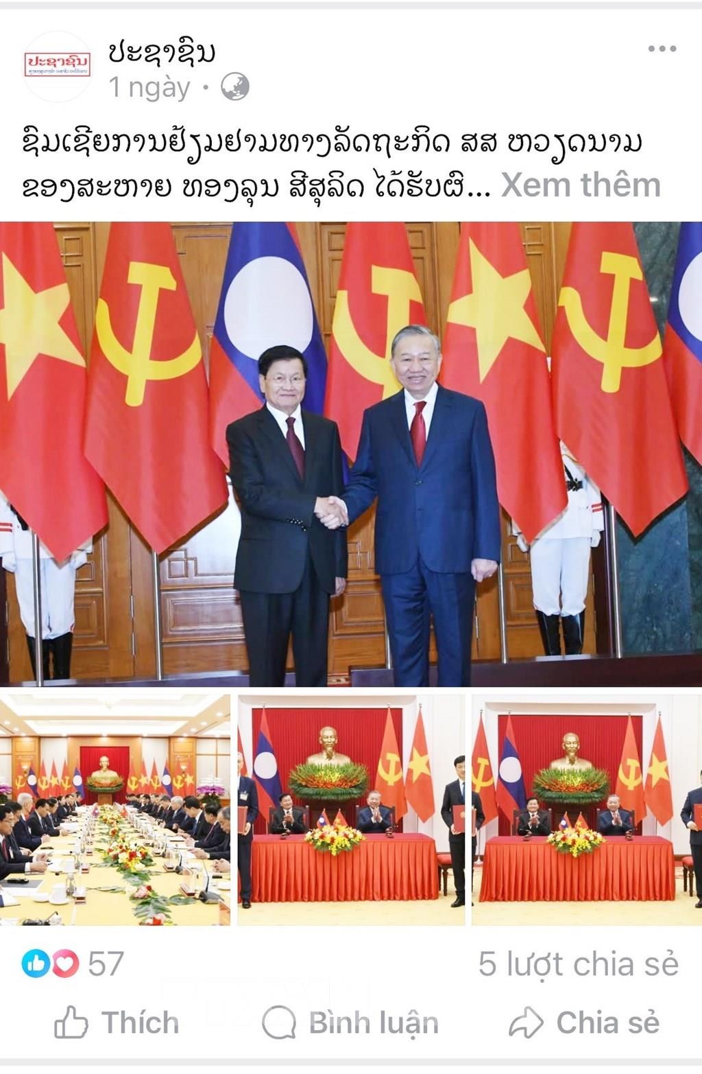 Các báo như Pasaxon, cơ quan ngôn luận của Trung ương Đảng Nhân dân cách mạng Lào; Pathetlao, ấn phẩm của Hãng Thông tấn quốc gia Lào; Vientiane Times, ấn phẩm tiếng Anh thuộc Ban Tuyên huấn Trung ương Đảng Nhân dân cách mạng Lào; cho đến báo Kongthap của Quân đội Lào, báo Công an Lào, Vientiane Mai, Kinh tế-thương mại, Đài Phát thanh Quốc gia Lào… đều đăng tải liên tục các hoạt động của Tổng Bí thư Tô Lâm và Đoàn đại biểu cấp cao Việt Nam tại Lào. Truyền thông nước này khẳng định đây là sự kiện đối ngoại có tầm vóc lịch sử, tạo ra cột mốc chiến lược quan trọng để đưa mối quan hệ hữu nghị vĩ đại, đoàn kết đặc biệt, hợp tác toàn diện và gắn kết Lào-Việt Nam, Việt Nam-Lào bước vào một giai đoạn phát triển mới, thực chất và bền vững hơn.