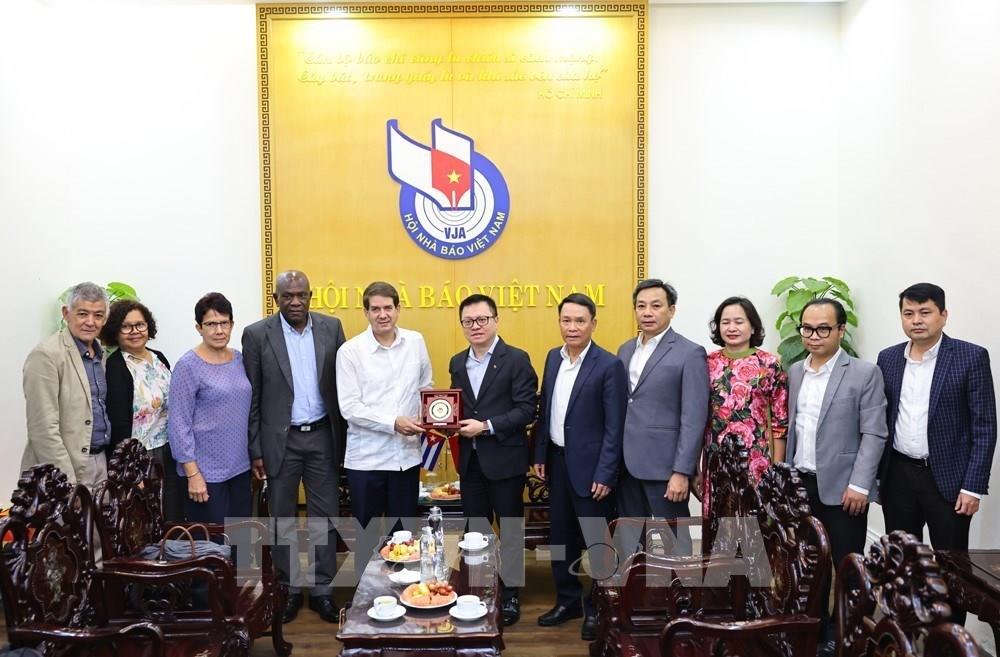 Chủ tịch Hội Nhà báo Việt Nam Lê Quốc Minh với Chủ tịch Hãng thông tấn Prensa Latina (Cuba) Jorge Leganõa Alonso và các đại biểu. Ảnh: Minh Đức – TTXVN