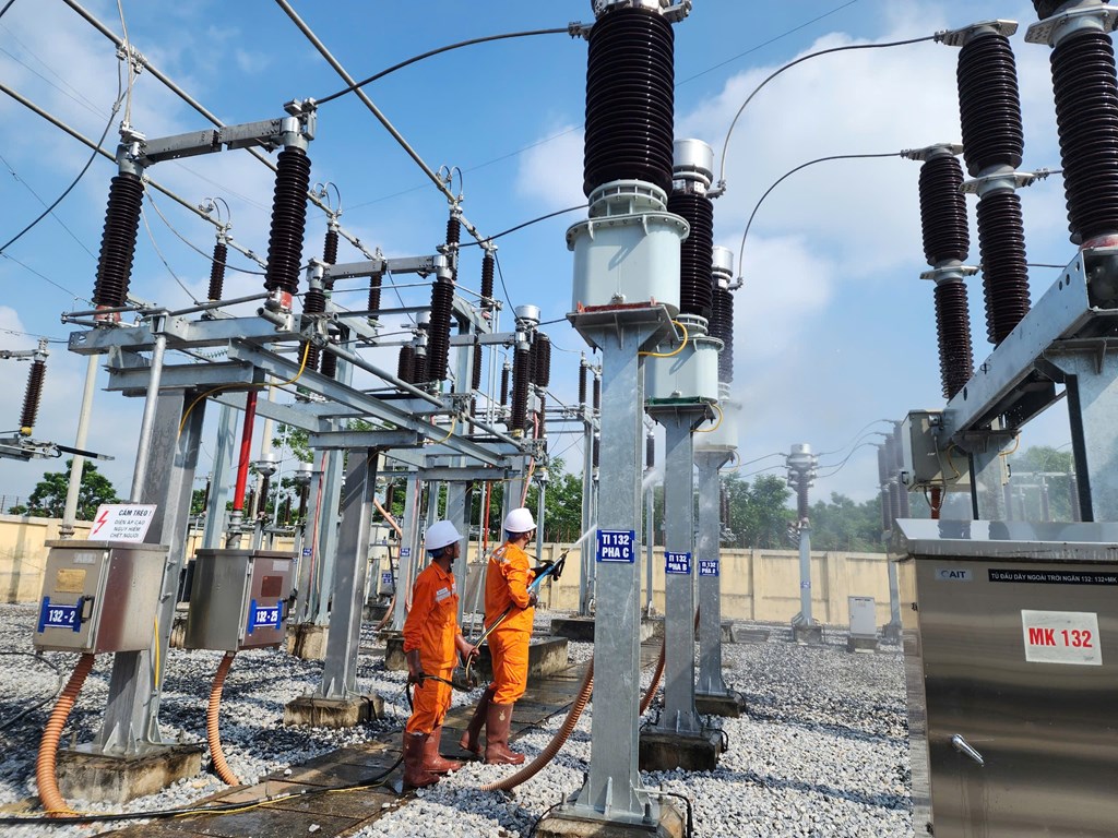 Nhân viên Điện lực EVNNPC thực hiện rửa sứ cách điện tại trạm biến áp, bảo đảm vận hành an toàn, ổn định hệ thống điện.