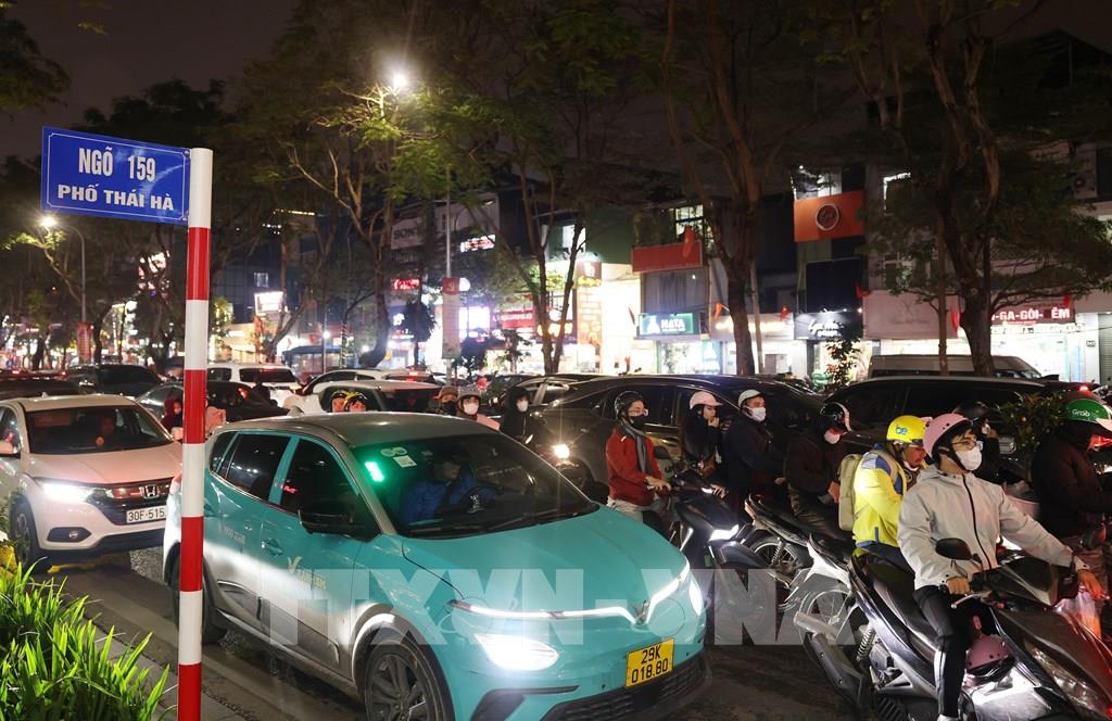 Các phương tiện di chuyển khó khăn cả hai chiều trên phố Thái Hà, tối 9/2. Ảnh: Quốc Khánh - TTXVN