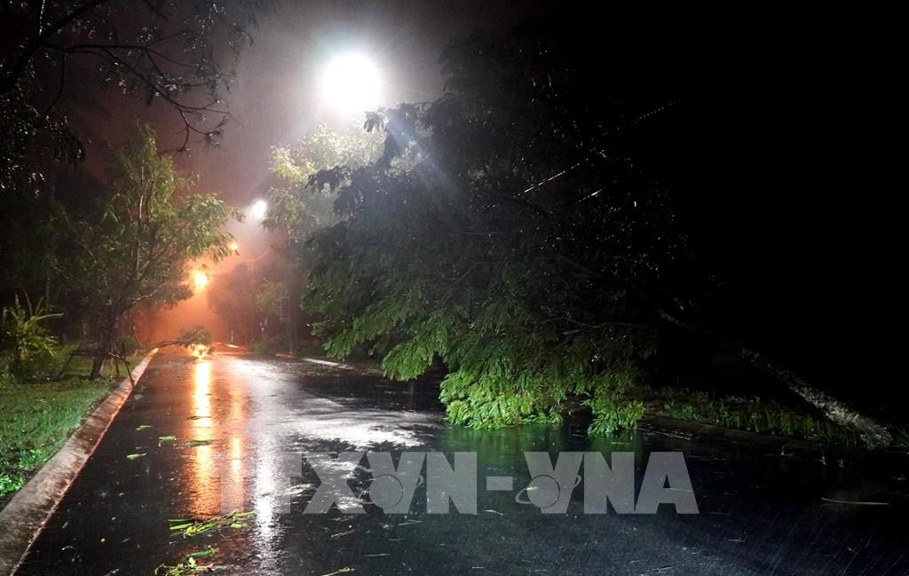 Cây cối ngã đổ ra đường do gió quật. Ảnh: Lê Phước Ngọc - TTXVN