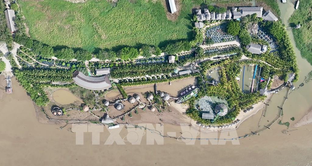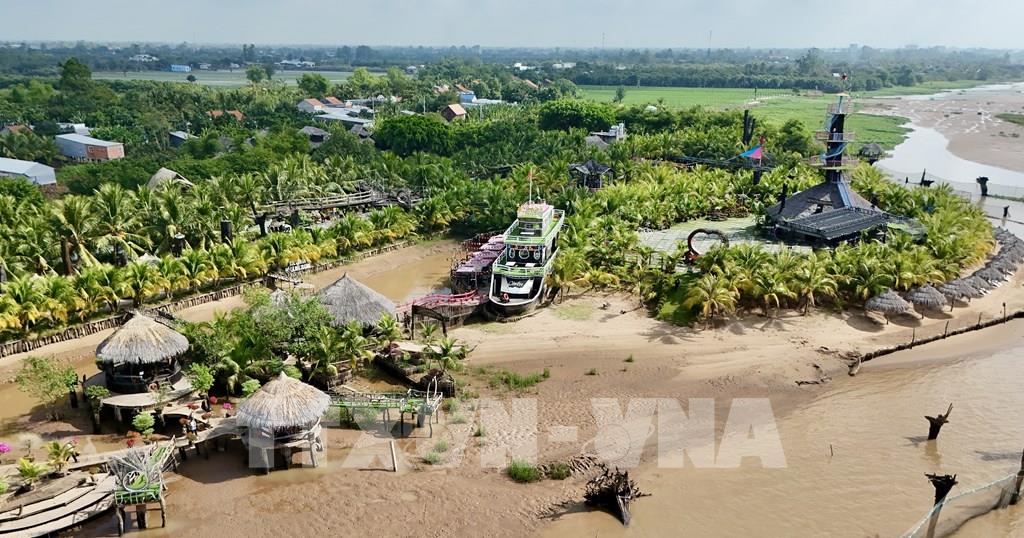 Khu tham quan gỗ lũa trên Cồn Én (xã Cù Lao Giêng, tỉnh An Giang) nổi bật giữa dòng sông Tiền hiền hòa. Ảnh: Thanh Sang-TTXVN