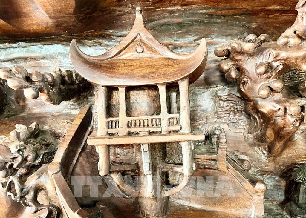 Hình ảnh Chùa Một Cột được chạm khắc tinh xảo trên bức tranh gỗ lũa, tái hiện nét văn hóa đặc trưng miền Bắc. Ảnh: Thanh Sang-TTXVN