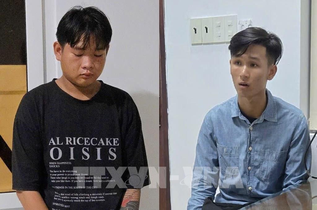 Hai đối tượng cướp giật Trương Vũ Khánh và Lê Quốc Trung Kiên tại cơ quan Công an. Ảnh: TTXVN phát