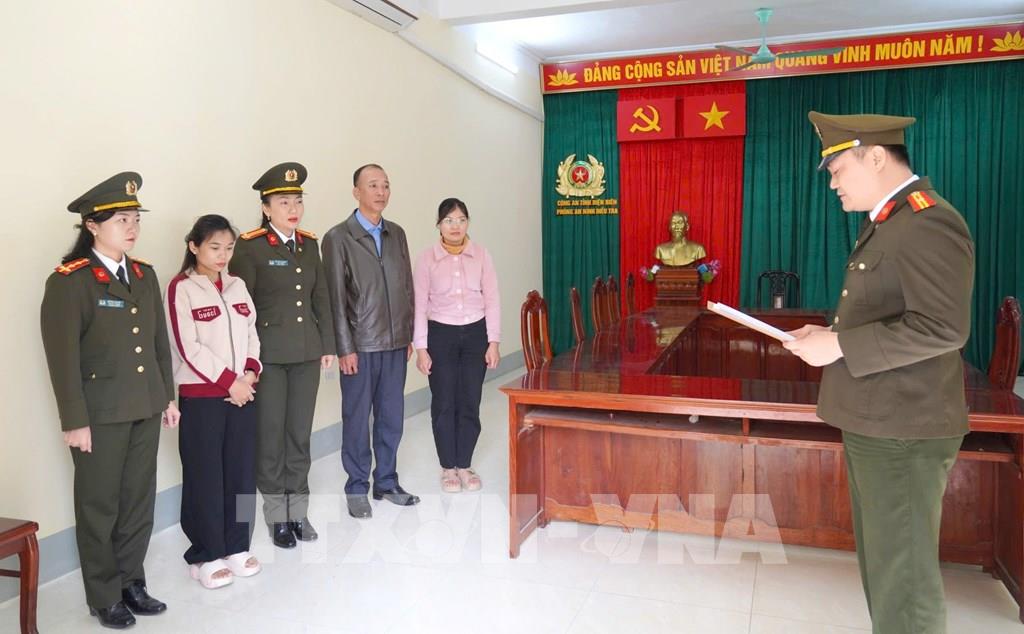 Cơ quan An ninh điều tra công an tỉnh Điện Biên đọc Quyết định khởi tố vụ án, khởi tố bị can và thực hiện lệnh bắt bị can để tạm giam đối với Lò Thị Hoài. Ảnh: TTXVN phát